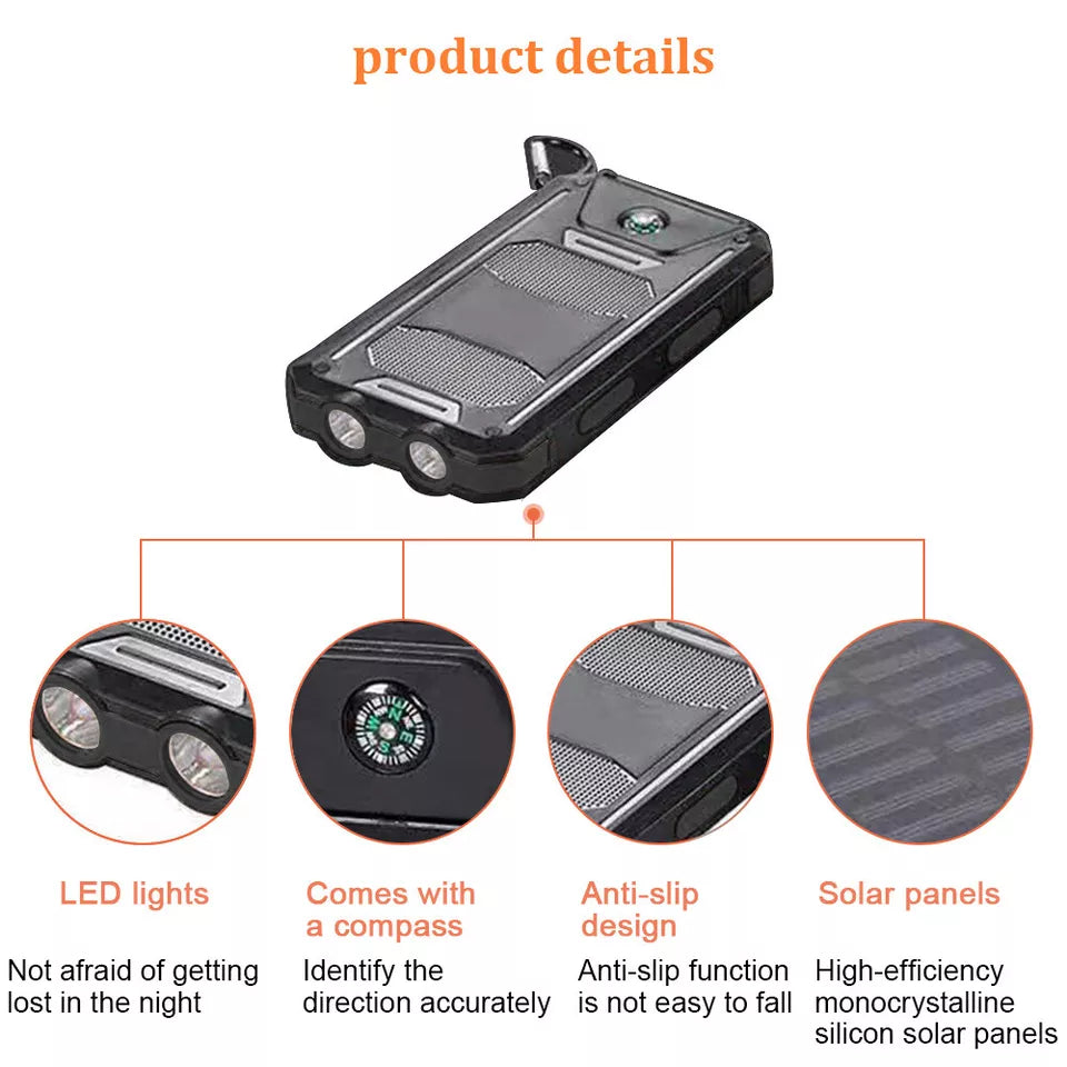 Emergency‑Ready: Integrated solar panel and dual LED flashlight ensure you’re prepared for power cuts or off‑grid adventures.