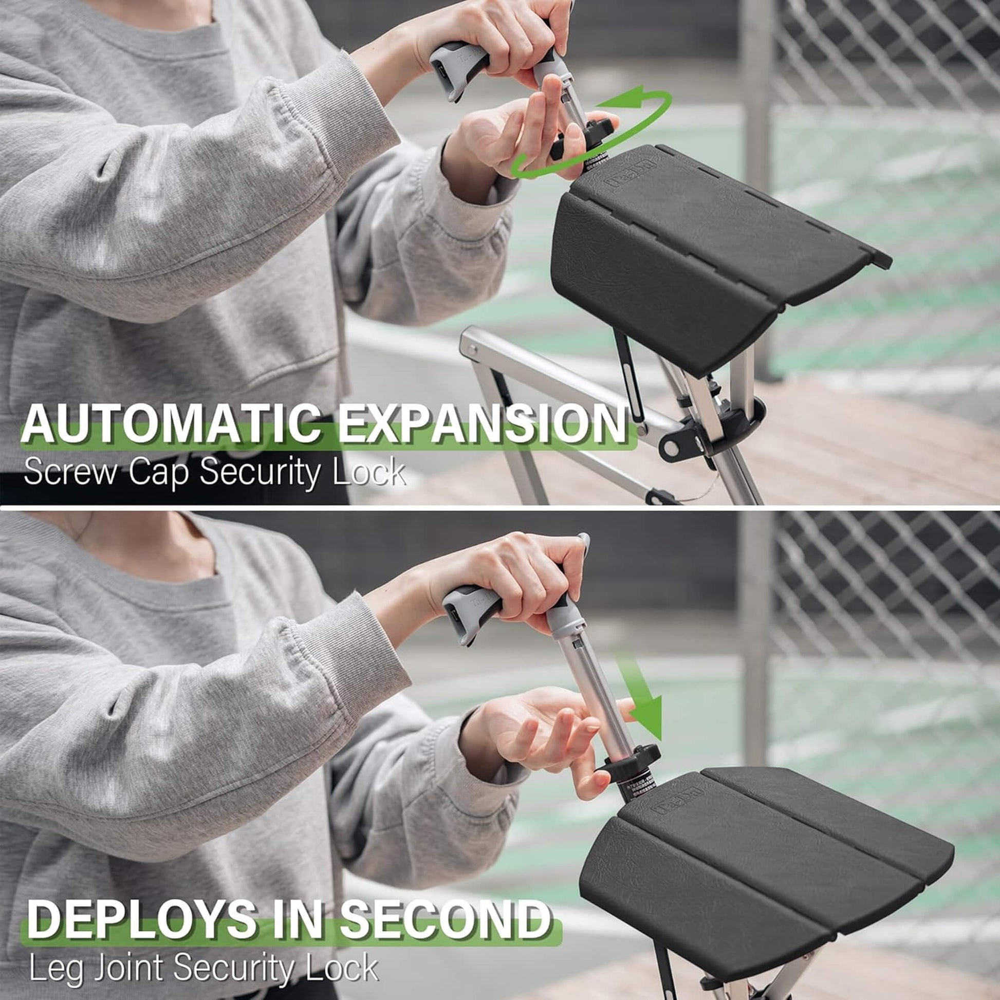 - Folding Mechanism: One-step hinge lock system with safety latch