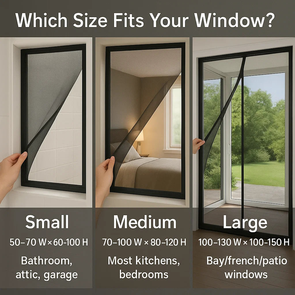 | Large | 100–130 W × 100–150 H | Bay/french/patio windows |