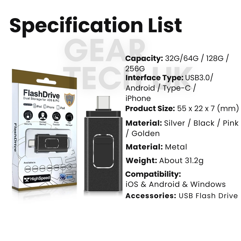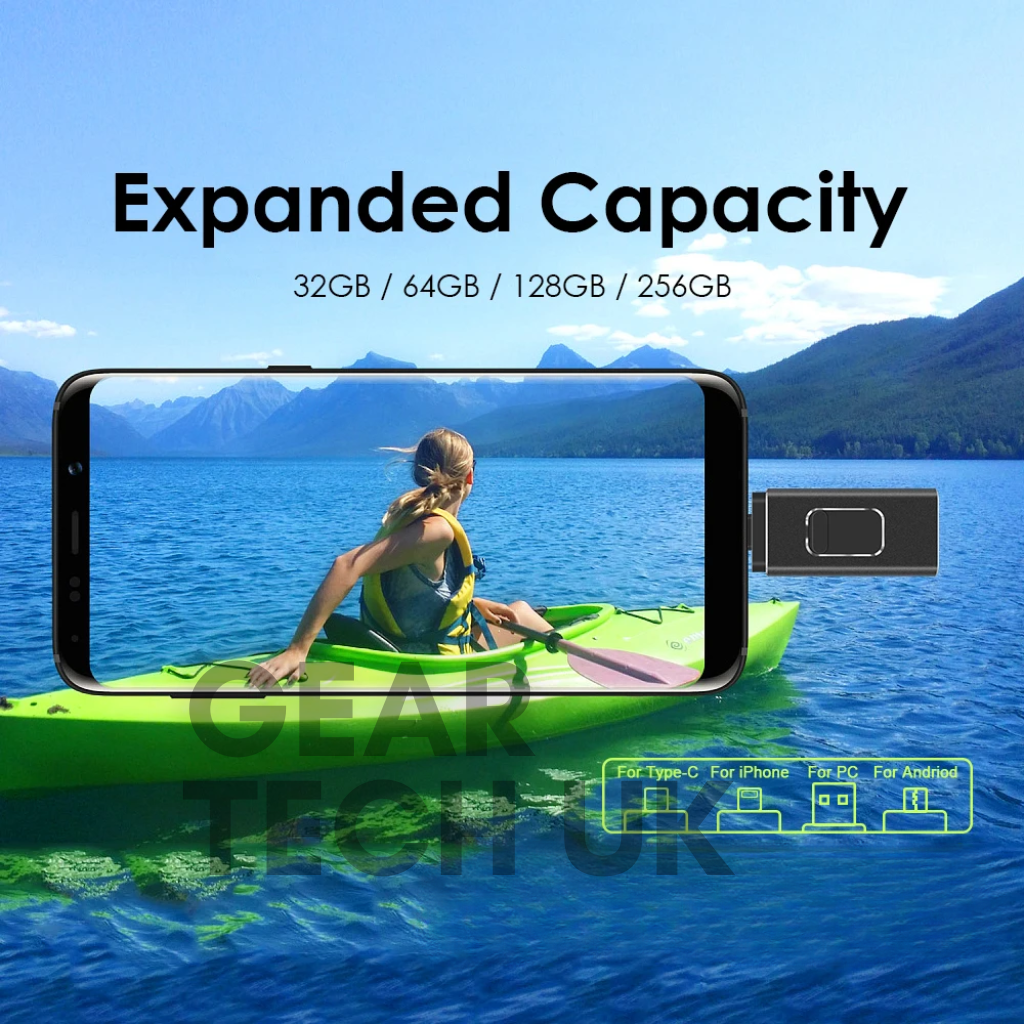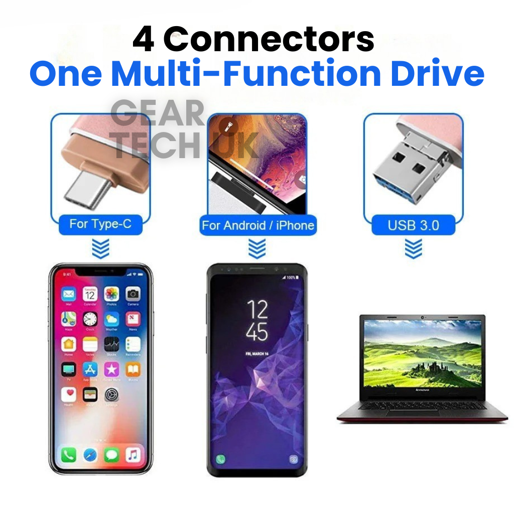Running out of space on your phone, tablet or laptop? This 4-in-1 USB stick is the ultimate USB storage device for freeing up memory and transferring files in seconds. Compatible with USB, USB Type-C, Lightning and Micro-USB, it works seamlessly across iPhones, Android devices, iPads, MacBooks and PCs without the need for extra adapters.
