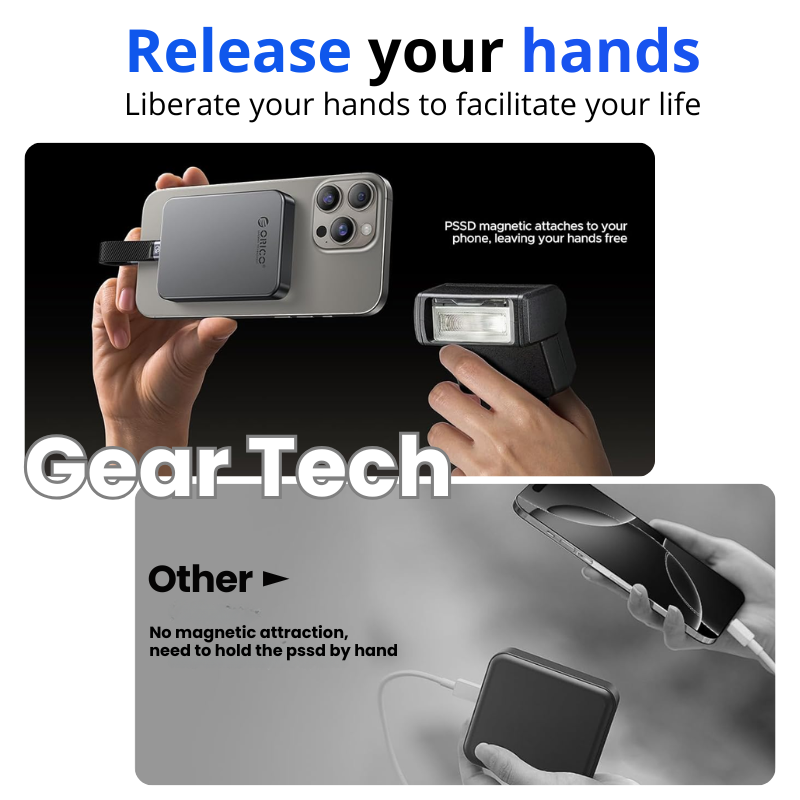 Forget bulky portable hard drives. At just 68 × 60 × 7.5mm and only 0.75cm thick, the ORICO K20Mini is slimmer than a bank card. The strong MagSafe-compatible magnetic attachment keeps it securely in place on your iPhone while filming, and the included magnetic ring allows you to attach it to any device. Lightweight, ultra-thin, and built from aluminium alloy for heat dissipation, this portable storage drive is made for creators on the move.