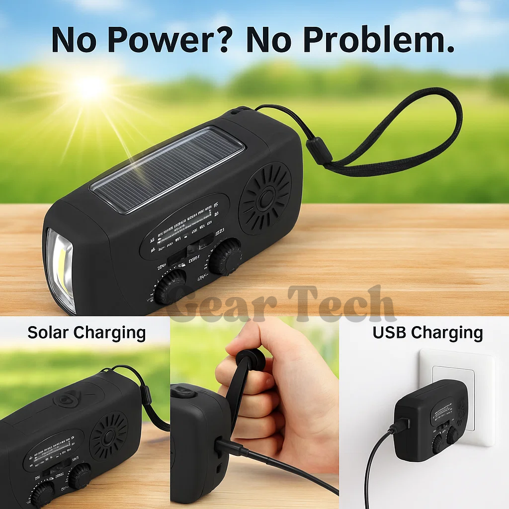 ✅ Solar, USB, and hand-crank powered