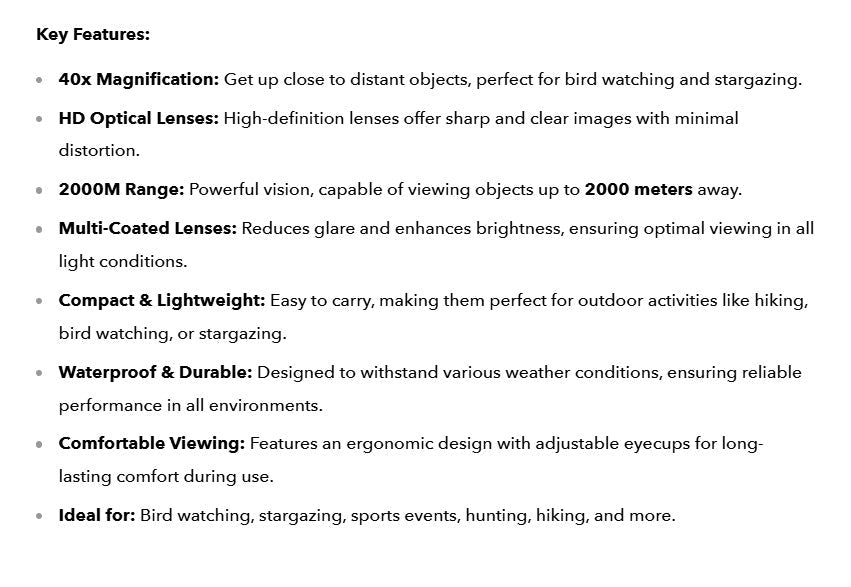 Want to see wildlife & stars clearly without straining? Bring distant views into sharp focus with our Premium 40×22 HD Binoculars — rugged, high-definition optics made for birdwatching, hiking, stargazing or any adventure under the sky.